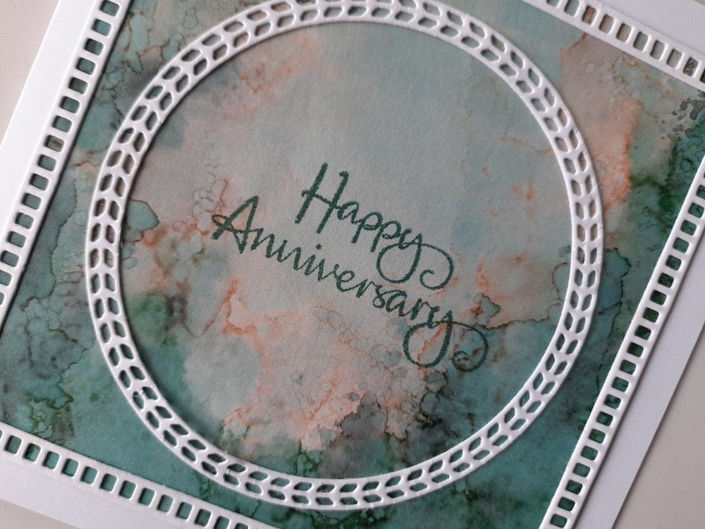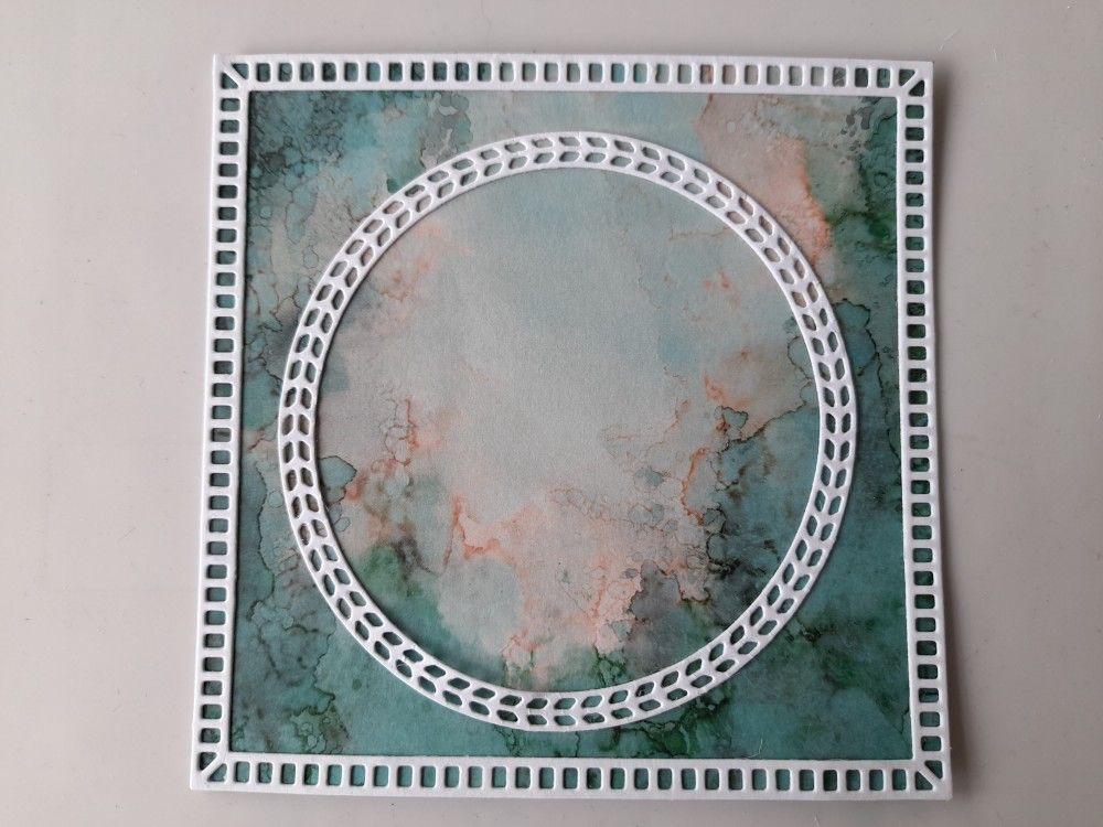 I needed to make a wedding anniversary card for friends, and thought the dies would make a great feature with Clarity’s designer card. I started by cutting a set of the square and circle frames in white card and then selected one of each for the card. I trimmed down a piece of the ‘Shenandoah’ designer card and then glued the square frame around the edge and sat the circle inside it.