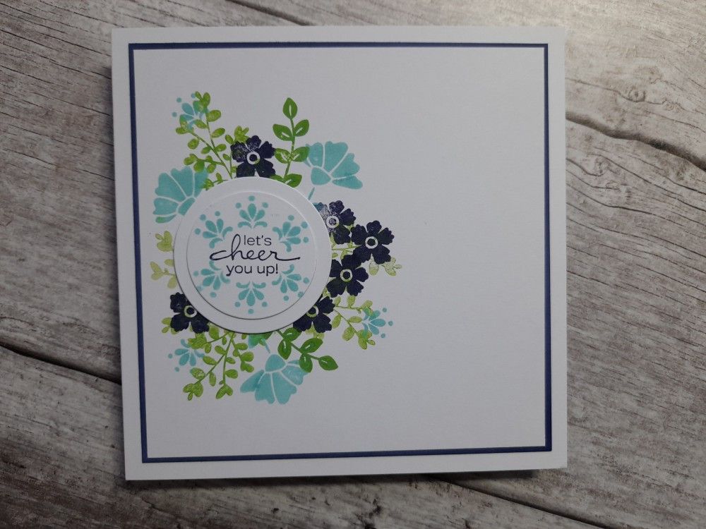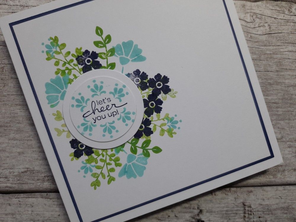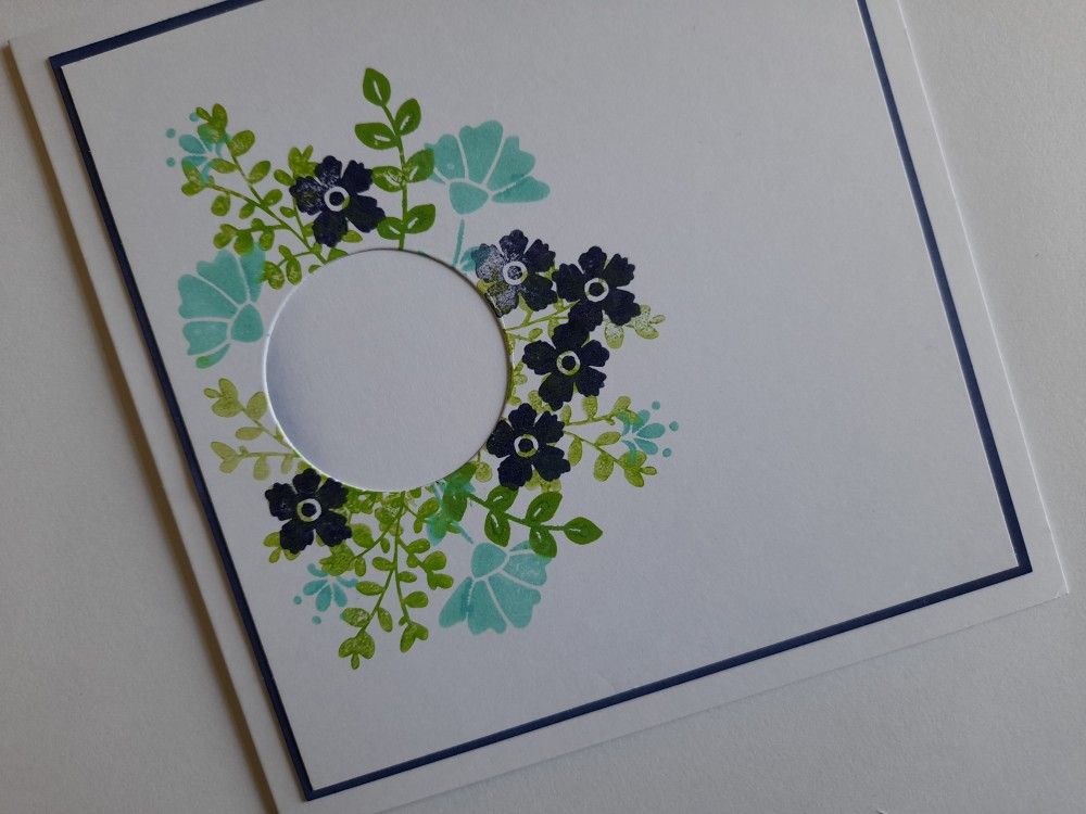 I started with a square of white card and die cut a small circle out of it. That gave me the focal point to stamp the leaves and flowers around it – I do like a bit of pattern building! I used Distress Oxides in ‘mowed lawn’, ‘chipped sapphire’ and ‘salvaged patina’.