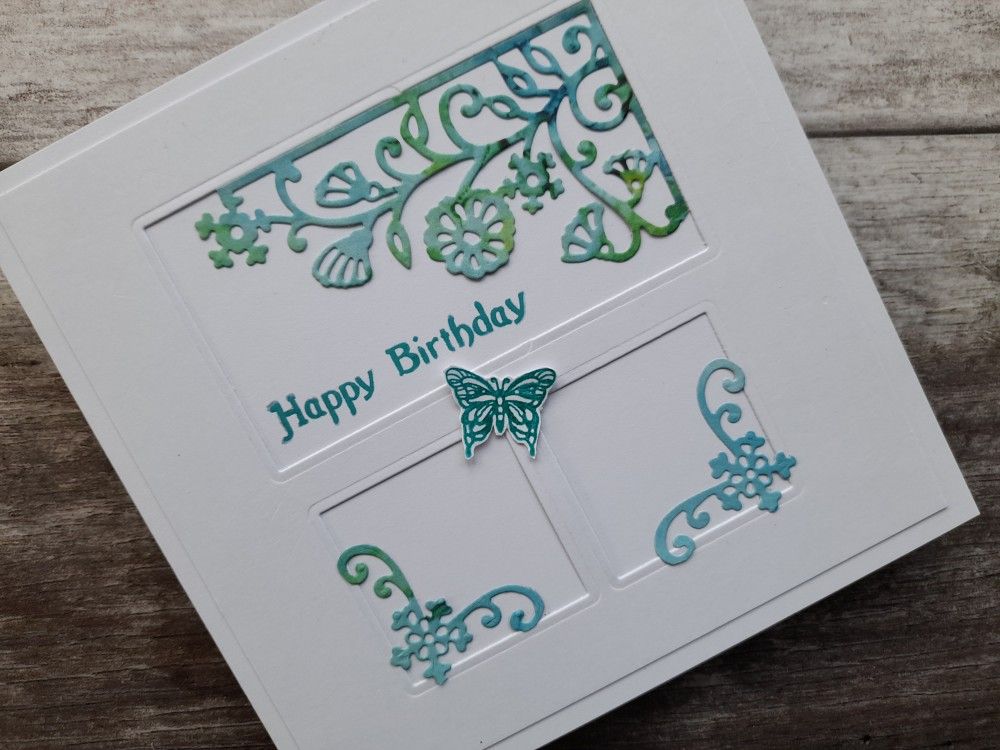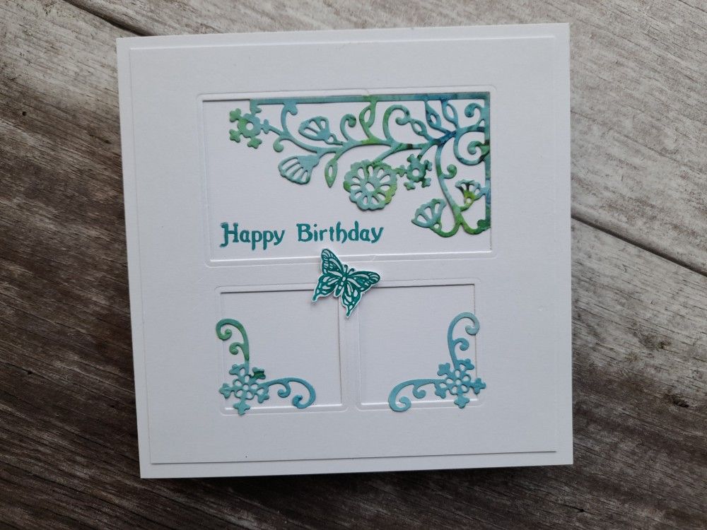 I stamped the sentiment inside the top aperture using ‘tenacious teal’ Artistry ink and then stamped the little butterfly (from the ‘blooming corner’ set) on a spare piece of card. I fussy cut it and glued him on the centre of the card.