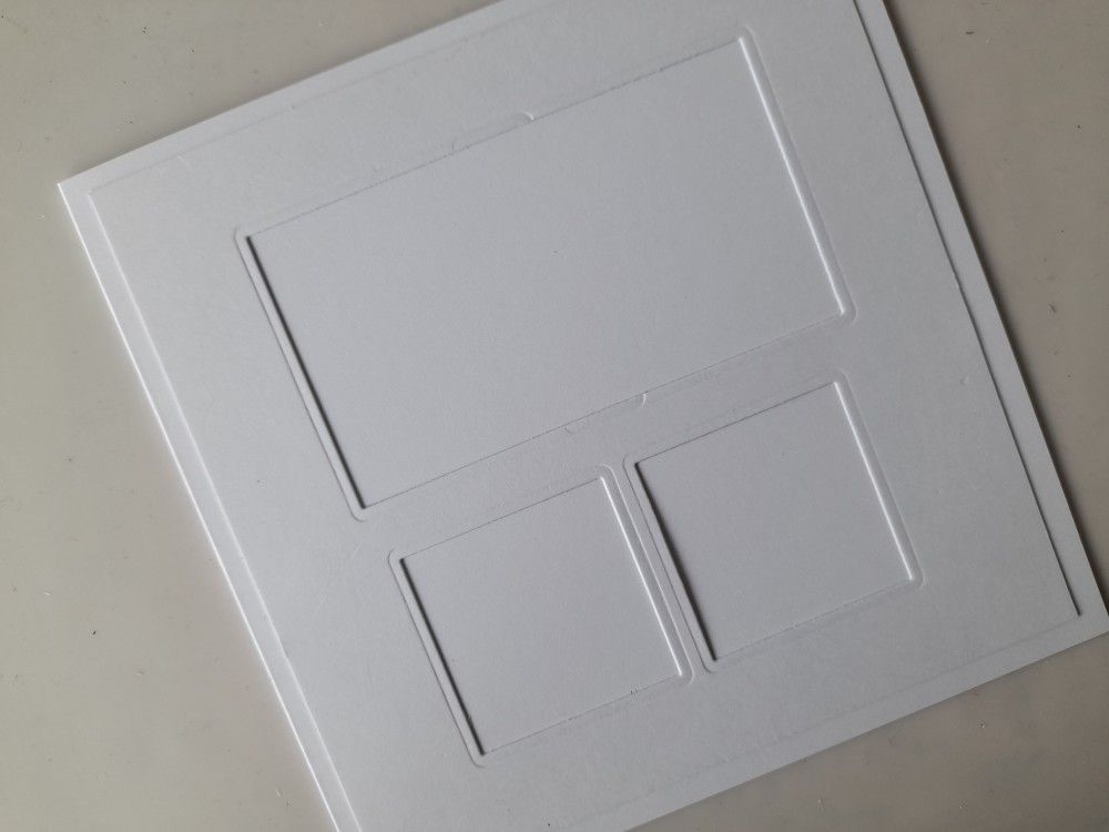 I started by die cutting the shapes into a square of white card, which I then attached to a 6×6 card blank. I didn’t have a rectangle die the right size for the top aperture, so I used a square die and overlapped the second cut to get the right shape.