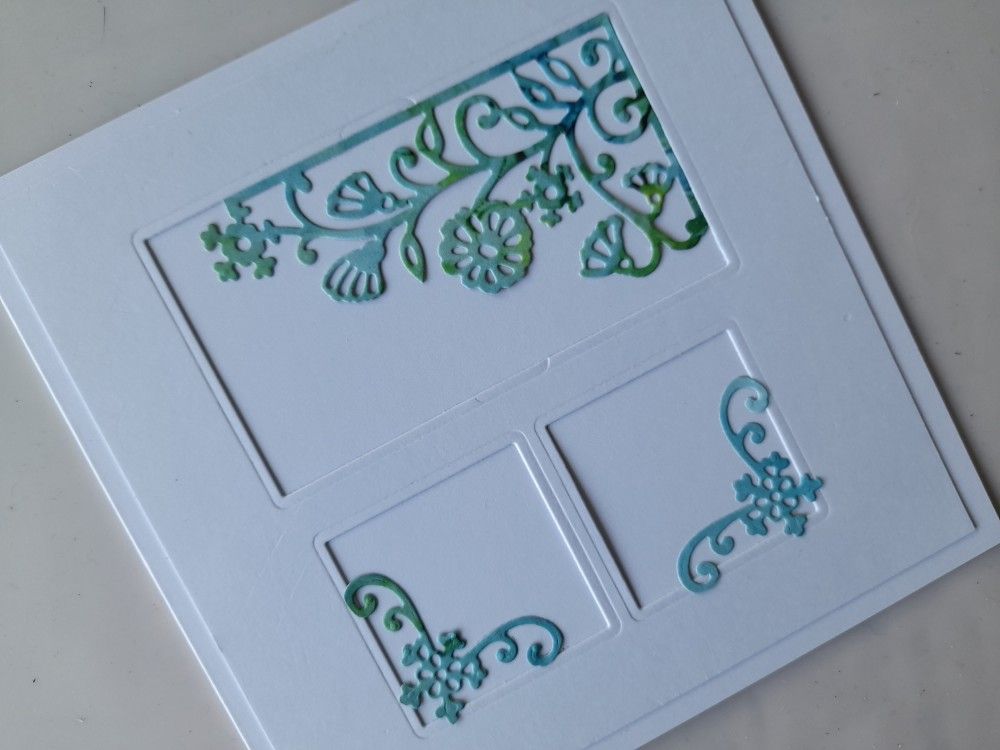 I then cut the floral frame out of a piece of ‘Antarctica’ designer paper, cutting the smaller one twice, and trimmed the shapes out of the frame. I attached the larger one inside the rectangle and put the two smaller ones across the bottom corners of the individual squares.