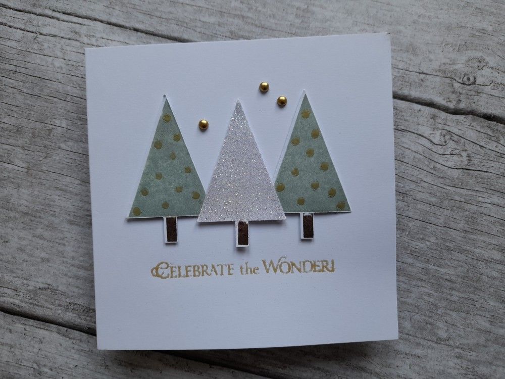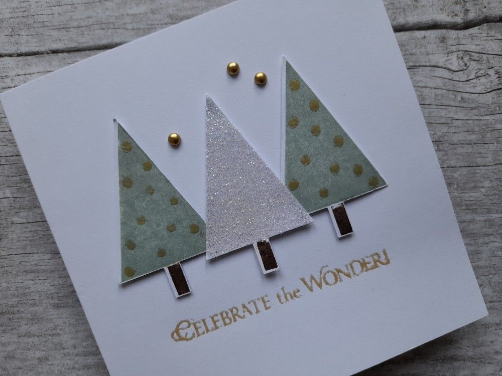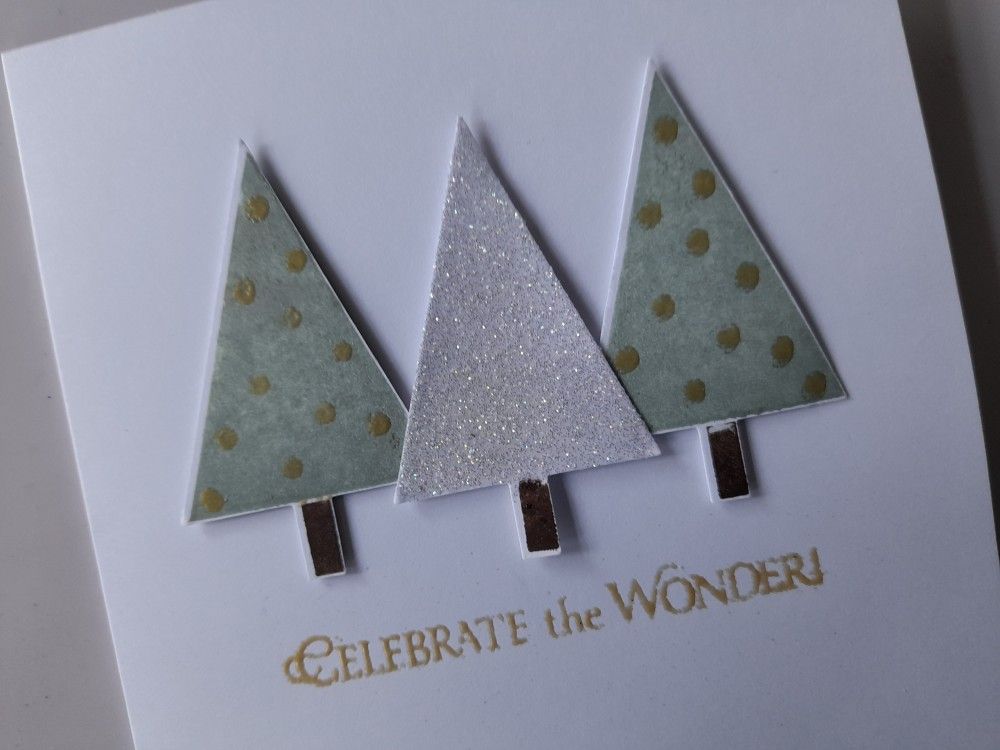 I heat embossed the sentiment onto a 5×5 card blank, again using WOW’s gold satin pearly powder, and then attached the trees above it with foam pads.