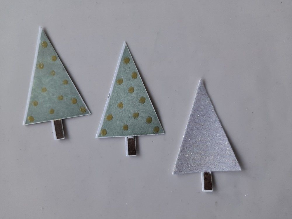 I started by stamping two of the trees in ‘iced spruce’ Distress Oxide, with the trunks in ‘potting soil’ Archival ink. I punched them out, together with a third all white one to which I just added the brown trunk. I heat embossed the gold dots onto the two green trees and embossed the white one with WOW’s clear sparkle powder.