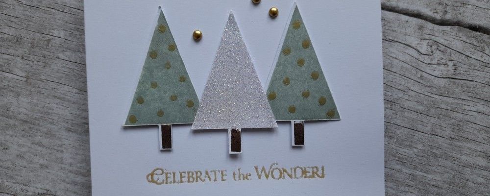 I started by stamping two of the trees in ‘iced spruce’ Distress Oxide, with the trunks in ‘potting soil’ Archival ink. I punched them out, together with a third all white one to which I just added the brown trunk. I heat embossed the gold dots onto the two green trees and embossed the white one with WOW’s clear sparkle powder.