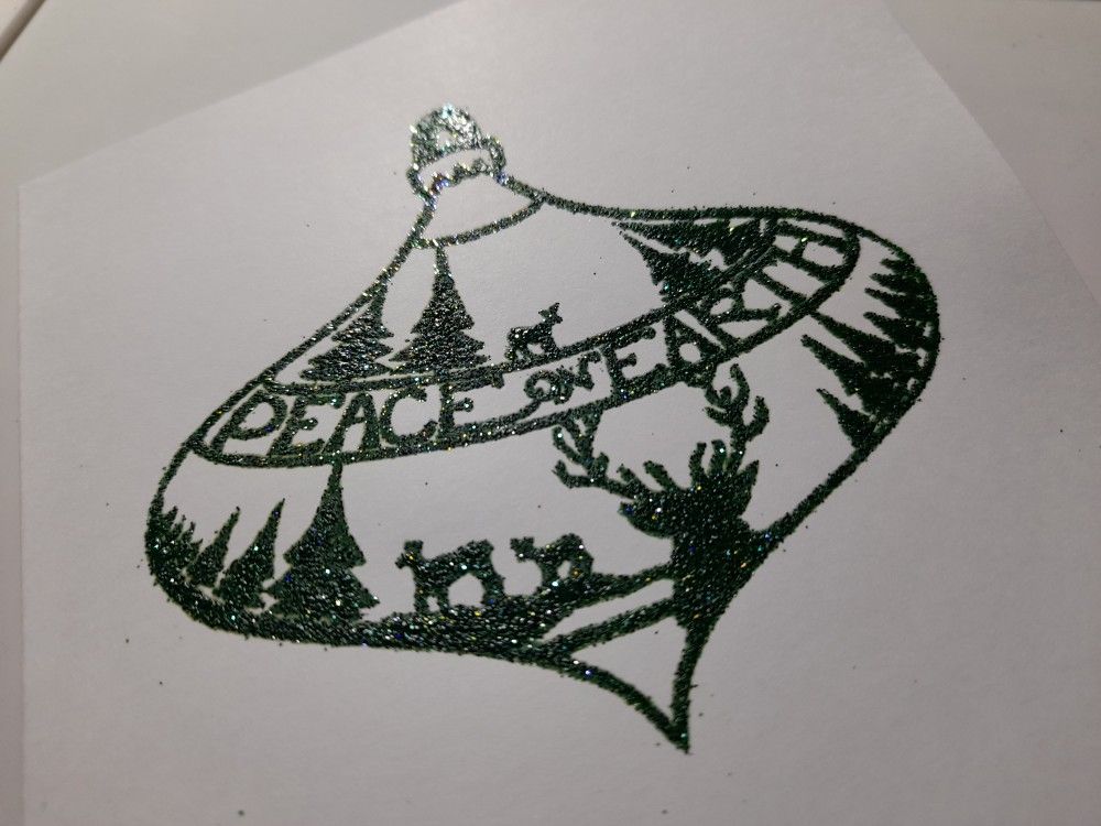Hello, crafty friends. I’m back after a few days away with my sister and then a little work trip, so thought I’d get straight back into harness with a (fairly) quick Christmas card! I haven’t done any crafting for the last few days and I was getting withdrawal symptoms!! This ‘peace on earth bauble’ stamp from Clarity is one of my favourites – it comes out every year but I try to do something different with it each time.