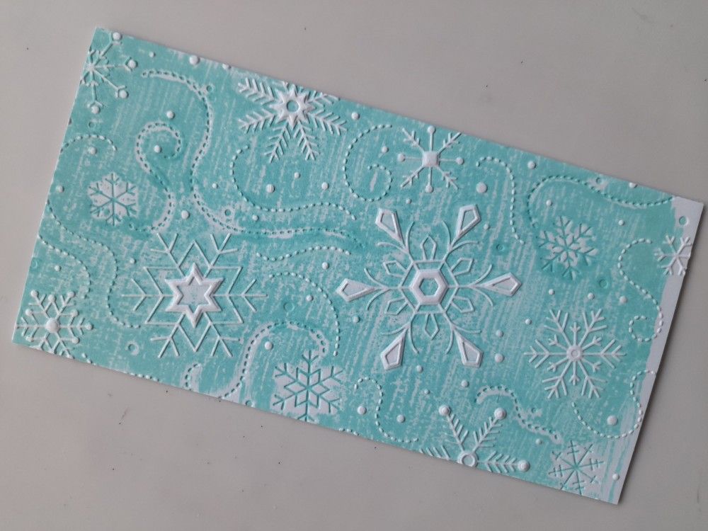 I started with the snowflakes mini embossing folder from SU’s ‘wintry’ set. I dragged ‘salvaged patina’ Distress Oxide across one side of it and then embossed a piece of white card. I love the way this technique throws the snowflakes into relief.