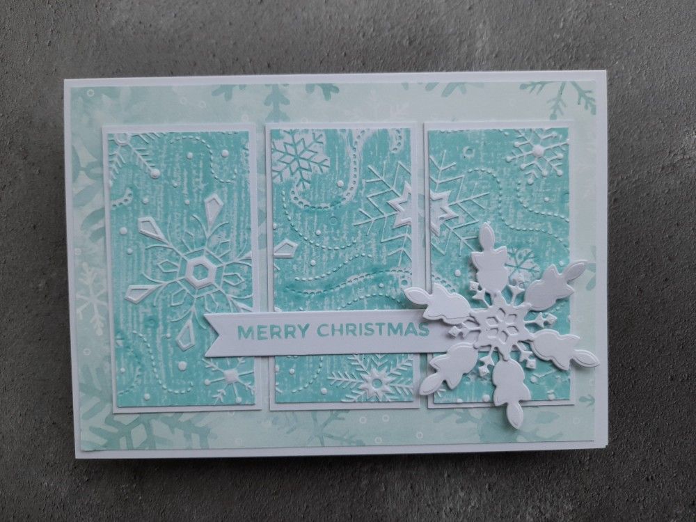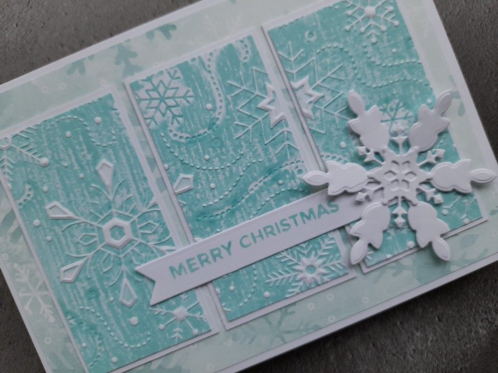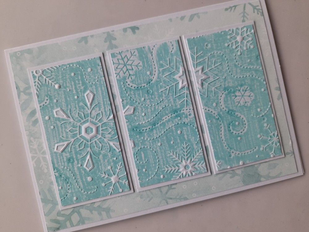 I then trimmed the embossed card into three strips and mounted them onto white card. I cut a piece of snowflake paper from SU’s retired ‘snowflake splendour’ DSP, attached it to an A6 card blank and then added the three embossed strips.