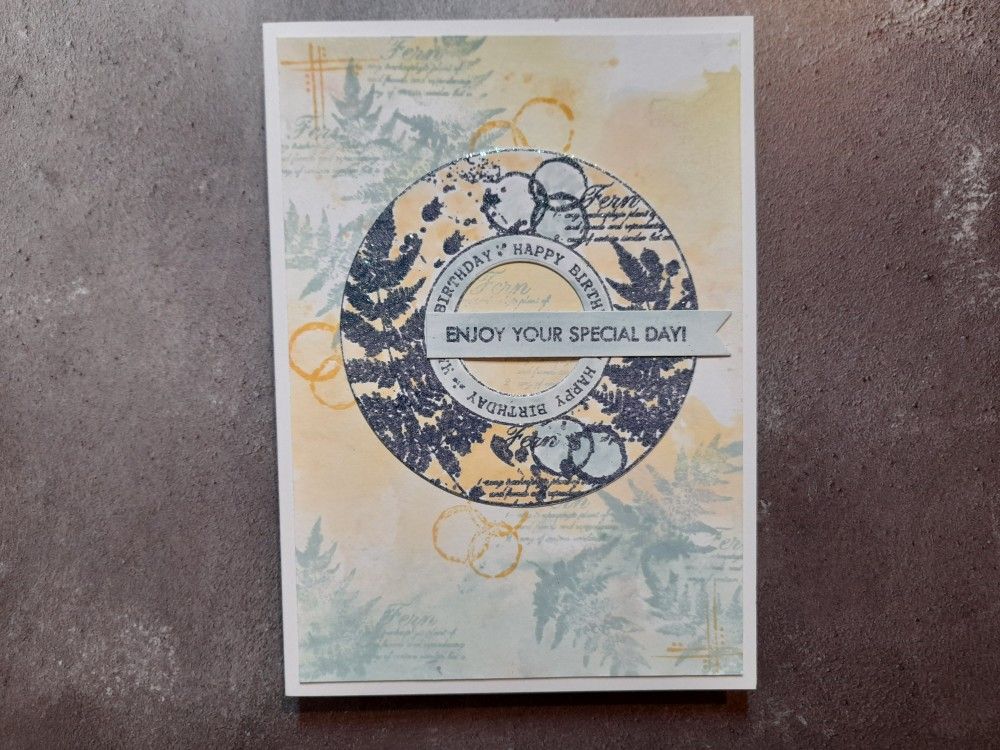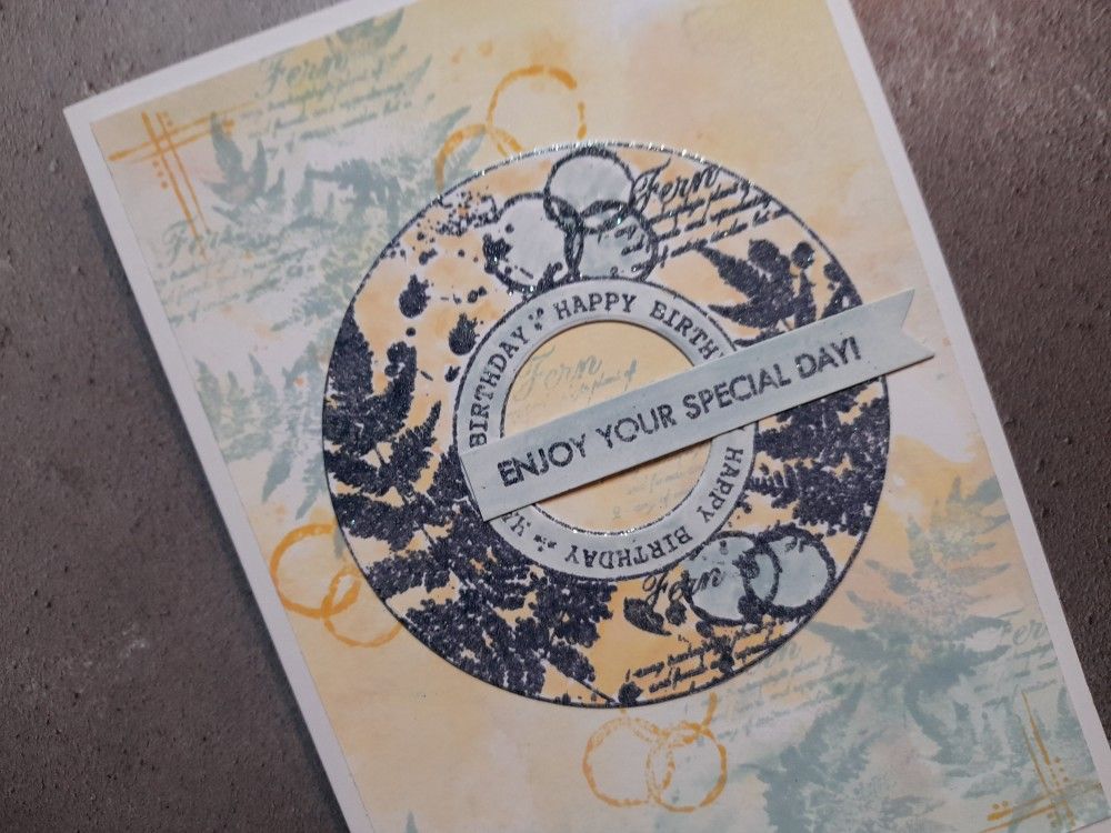 I then used several of the stamps in the set to create the background. I stamped the fern and the definition in ‘speckled egg’, with the circles and the scribbled corners in ‘dried marigold’.