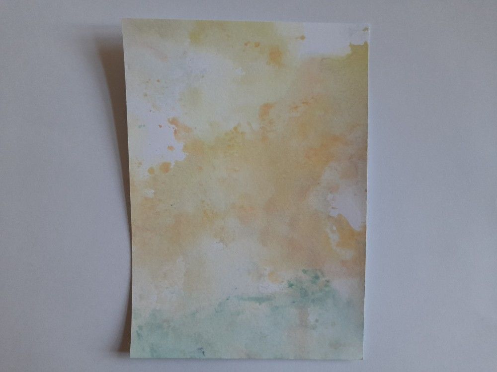 I started with one of my inky mop-up backgrounds and trimmed it down to fit a 5×7 card blank. One day I really will remember to write the ink colours on the back of these mop-up pieces so I can easily match them, without having to do a load of guesswork! I managed to work out that this piece had Distress Oxides in ‘dried marigold’ and ‘speckled egg’.