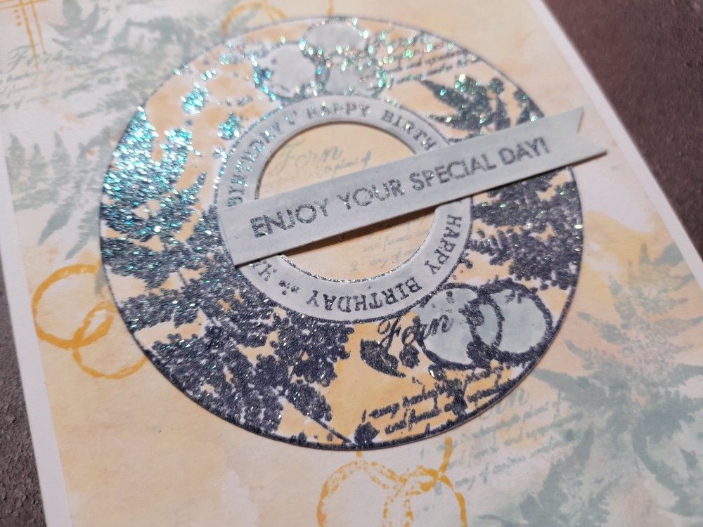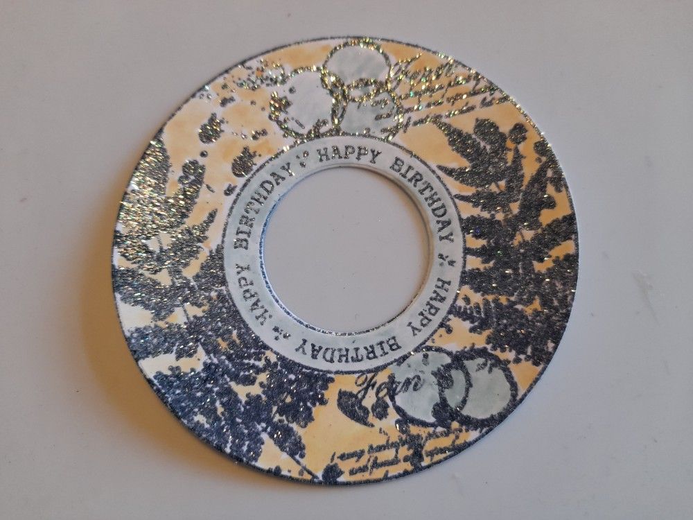 The next step was to stamp the large circle on WOW clear ink onto white card and heat emboss it with their ‘Carnival’ embossing glitter. I coloured the card using the two Distress Oxides and a waterbrush, just doing it roughly so it picked up the style of the background piece, and then die cut it once dry. I managed to take this photo at an angle so you can see the sparkle from the embossing glitter.