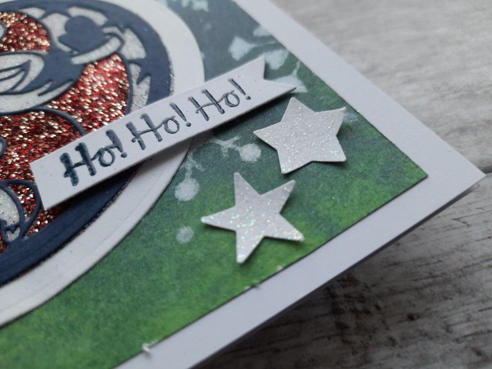 I decided it needed a few more stars to finish it off. I wanted them to sparkle, so brayered WOW clear ink onto a piece of white card and embossed it with clear sparkle powder before punching out several stars and gluing them in place.
