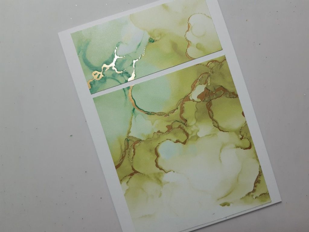 I bought the Stampin’ Up! ‘expressions in ink’ papers a few months ago, but hadn’t used them yet – they’re so lovely I just want to sit and stroke them! I decided it was time I took a deep breath and went for it, so I trimmed a piece of the green and gold paper down to fit an A6 card blank.