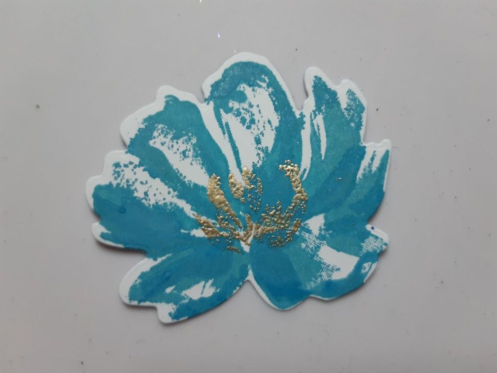 I then stamped the large flower from the ‘art gallery set in ‘broken china’ Distress Oxide. I used the two layering stamps first (drying the ink in between with my heat gun) and then stamped the small centre with WOW clear ink and heat embossed it in metallic gold powder, to reflect the gold effect on the backing paper. Once dry I die cut it out.