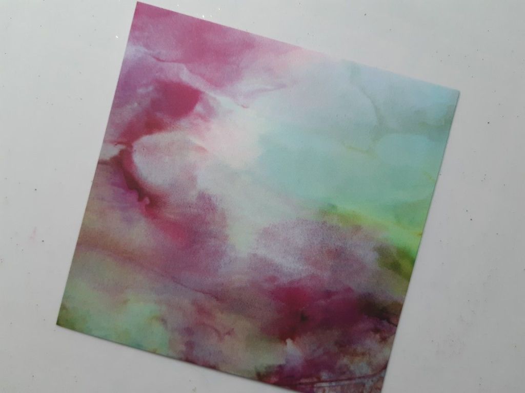 I started by trimming down a piece of the paper to fit a 6×6 card blank. I love the effect of these designs – depending how you use it, there are all sorts of landscapes and effects to be seen in the ink patterns.