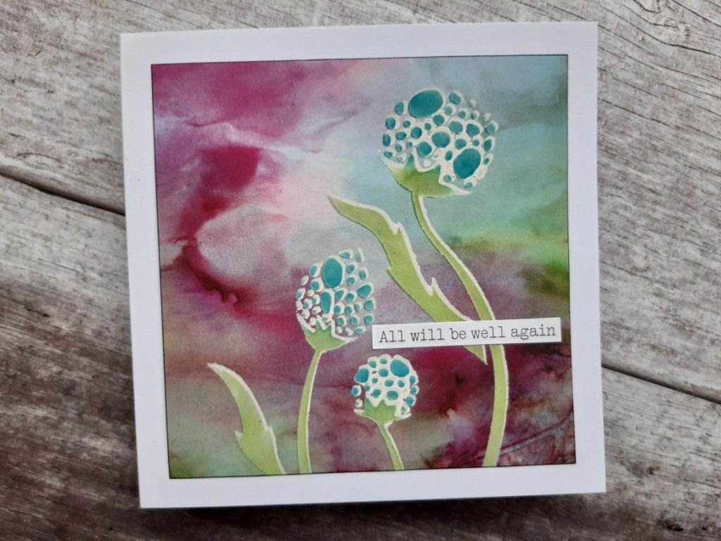 Result! I’m always telling others not to give up and keep on going until it’s finished, so it was about time I took my own advice! Once dry I attached it to the card blank and added one of the Clarity word stickers to finish.