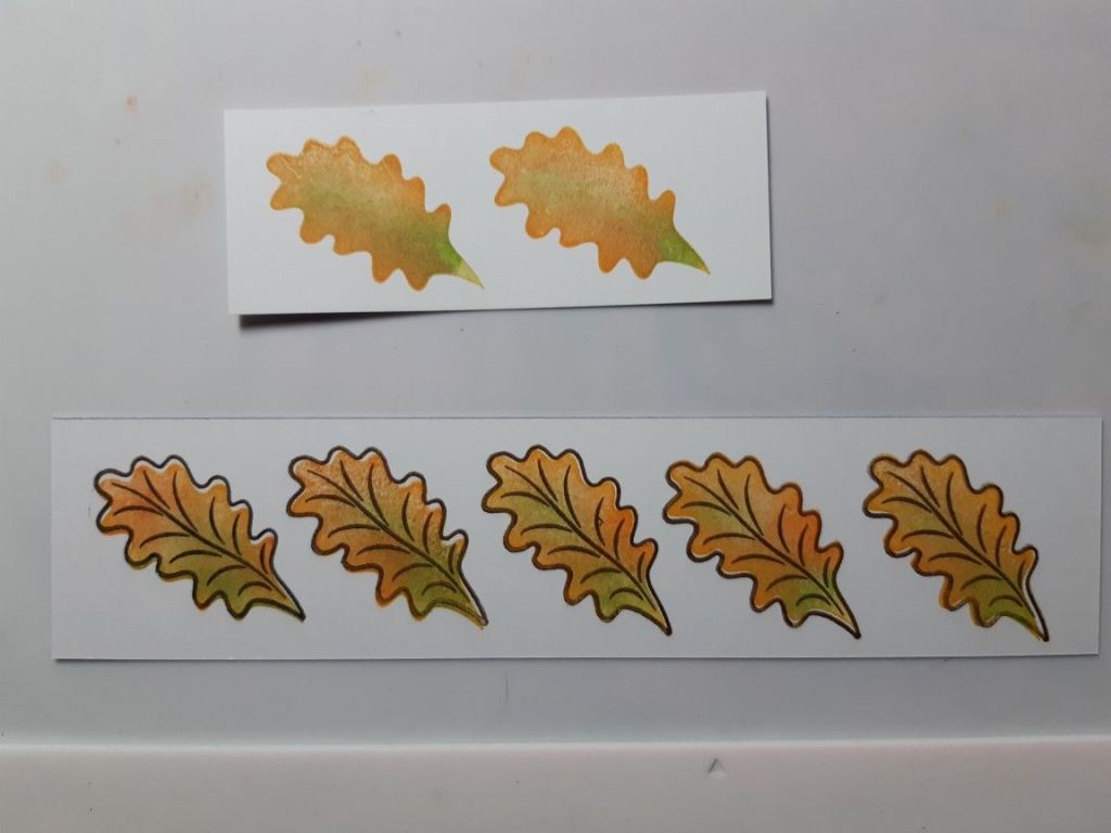 I started with the two way overlay oak leaf stamp from Clarity (it’s quite an old one and I’m not sure if it’s still available). I blended Distress Oxides in ‘mowed lawn’, ‘ripe persimmon’ and ‘mustard seed’ onto the infill stamp using sponges, and then stamped the outline image over the top in ‘potting soil’ Archival ink. I find overlay stamps easier to do this way round, rather than stamping the outline first.