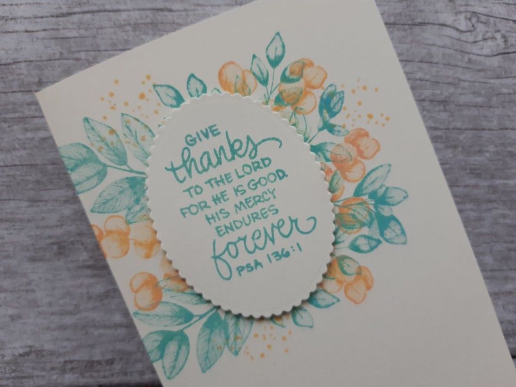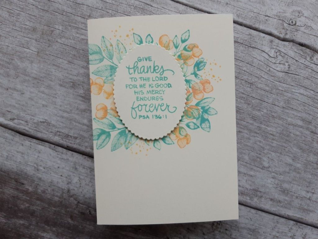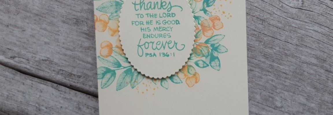 Hello crafty friends. Today’s card is another nice and simple CAS one, this time using one of the ‘Bible Verses’ set from Stampendous and Stampin’ Up!’s ‘forever fern’ stamp set. Once again I’ve managed to combine a few blog challenges with this one. I picked up the bible verse to fit The Paper Players‘ theme of ‘give thanks’ and then combined it with the colour palette from TGIF and the new layout from CAS Colours & Sketches.