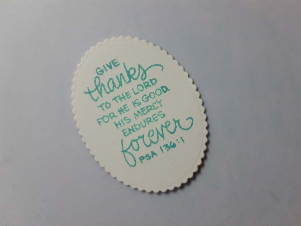 I don’t have ink pads in the SU colours that TGIF have chosen, so went for the nearest shades in Distress Oxides. I started by stamping the bible verse in ‘salvaged patina’ onto a piece of SU ‘very vanilla’ cardstock and then die cut it.