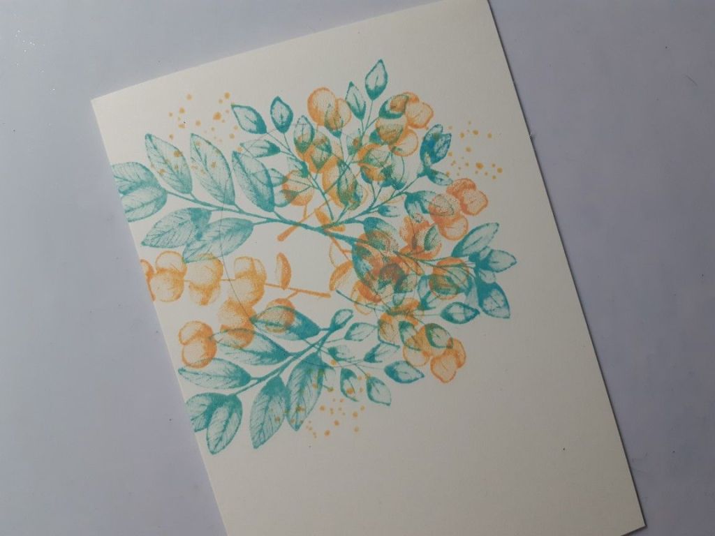 I then made an A6 card blank from another piece of the ‘very vanilla’ and stamped the ‘forever fern’ leaves and berries in the ‘salvaged patina’ and ‘dried marigold’. Slightly worried that I over cooked it on the right hand side!