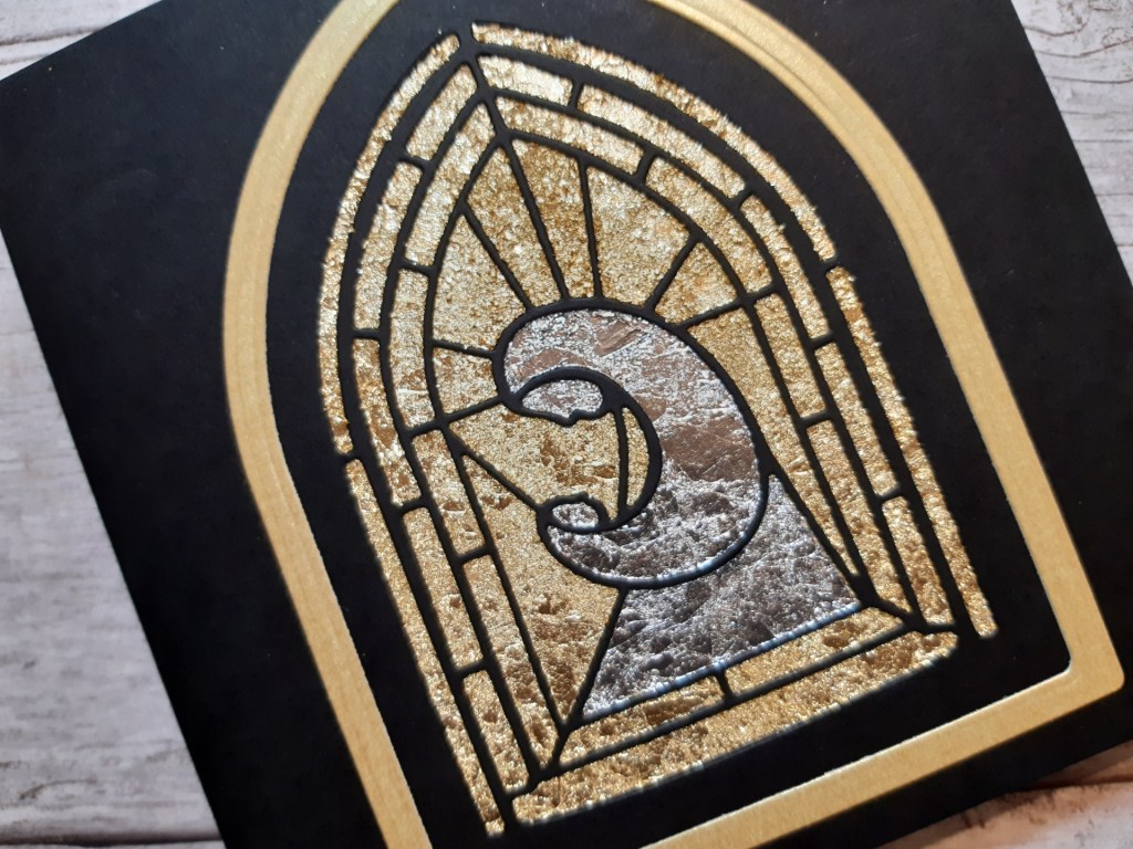I finished by die cutting a frame in gold card, using two of Clarity’s nested arch dies. I’d remembered to put a Stick It adhesive layer onto the back of the card before cutting it, so it was easy to attach to the card front.