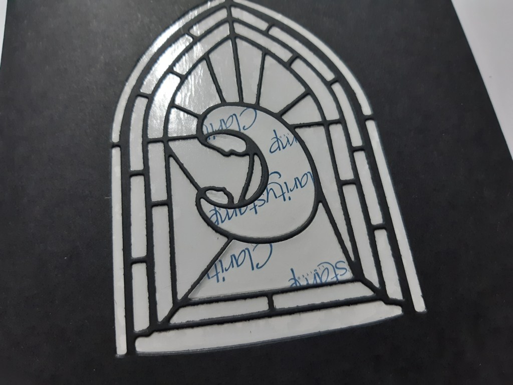 I then put a piece of Clarity’s double sided adhesive behind the die cut and attached a piece of white card to it (otherwise the inside of my card would have been stuck together!!) I die cut the backing sheet from the adhesive and covered up the madonna and child part of the image.