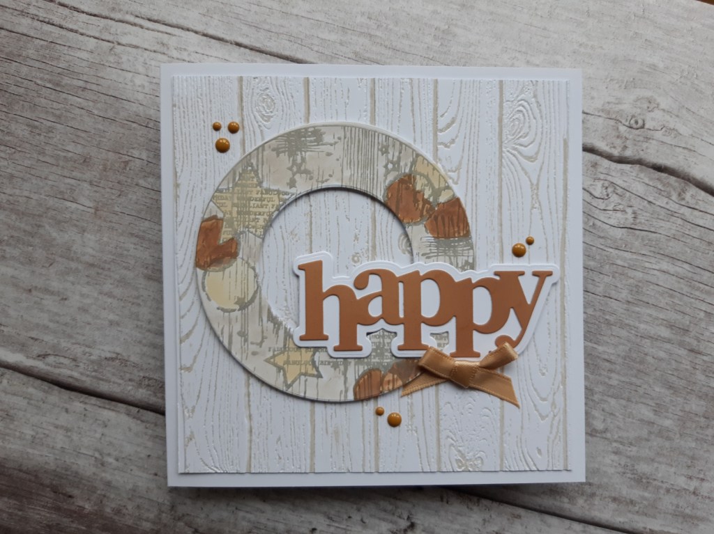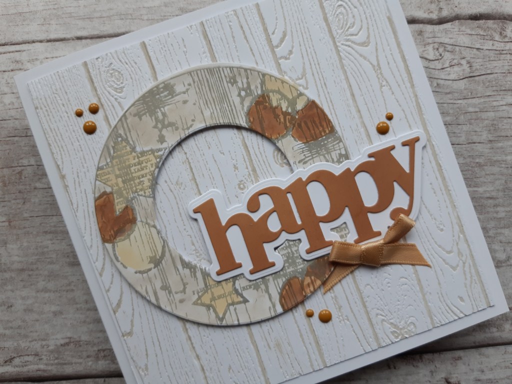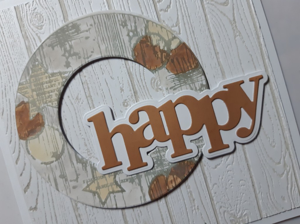 I blended the ‘walnut stain’ onto a piece of white card with a brush, and then die cut ‘happy’ from it, using another piece of white to die cut the mount. I glued them together and attached to the card front with more foam pads.