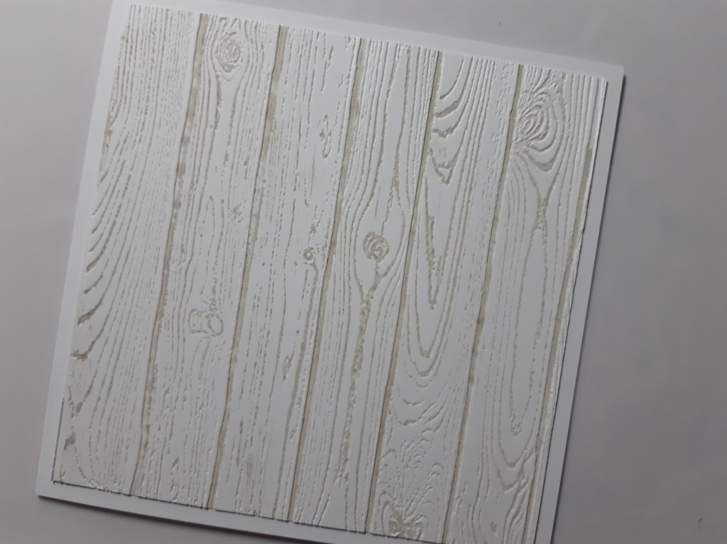I started with Stampin’ Up!’s ‘pinewood planks’ embossing folder and dragged ‘pumice stone’ Distress Oxide across it before running a square of white card through it. That piece then went onto a 6×6 card blank once dry.