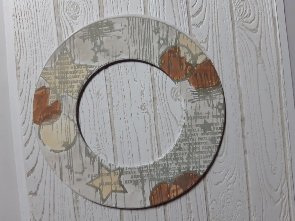 I then stamped the large circle from ‘all about the boys’ in ‘pebble shore’ Archival ink and cut it out using Julie’s circle frames dies. I picked out the circles and stars with ‘antique linen’ and ‘walnut stain’ Distress Oxides, adding the ‘pumice stone’ into the background. I popped it onto the card front using foam pads.