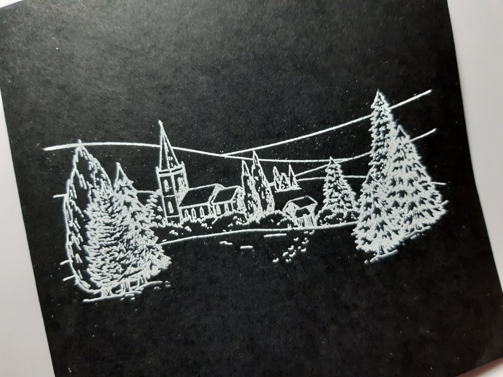 These stamp sets come with pre-cut masks, so I covered up the image and added one of Clarity’s moon masks. I bushed ‘pumice stone’ Distress Oxide through it to give me a soft moon. I then sprinkled WOW’s white ultra high powder on the card to look like snow (or stars?) and heated it to set it. I added some of the grey to the church and lychgate as well using a waterbrush.