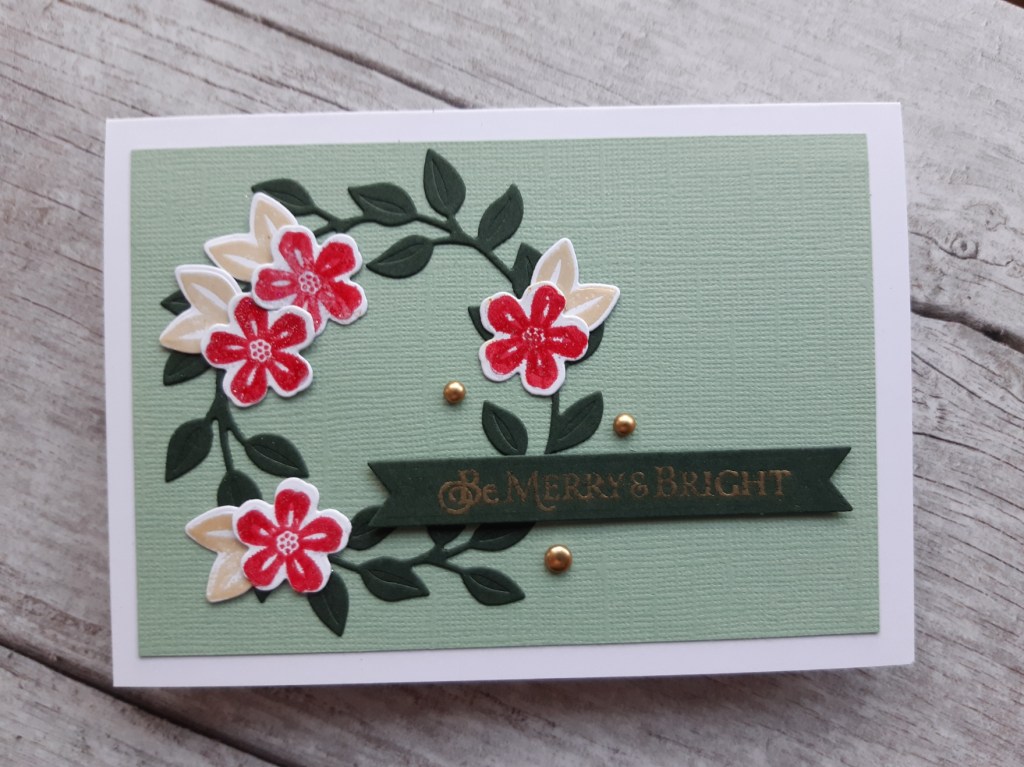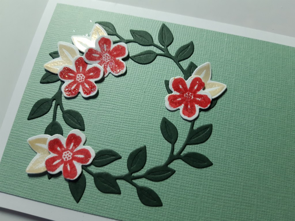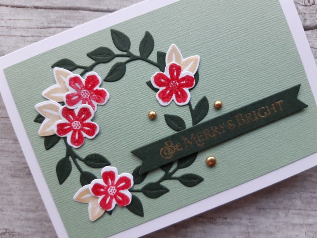I started by attaching a piece of light green card to an A6 card blank. I die cut the wreath in ‘evening evergreen’ and then glued it onto the card front. Now I forgot to take my usual step-by-step photos (sorry about that), so onto the next part, which was to stamp and die cut the flowers and leaves from the set. I stamped the flowers in ‘festive berries’ Distress Oxide and heat embossed them with WOW’s clear sparkle, and did the leaves with ‘gold satin’ powder (just pushing it a bit with the colours by swapping the yellow for gold!). I managed to get a photo at a ibt of an angle to show you some of the sparkle.
