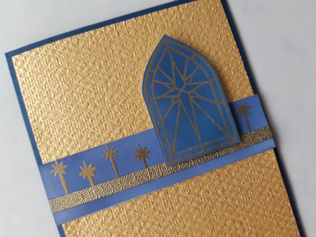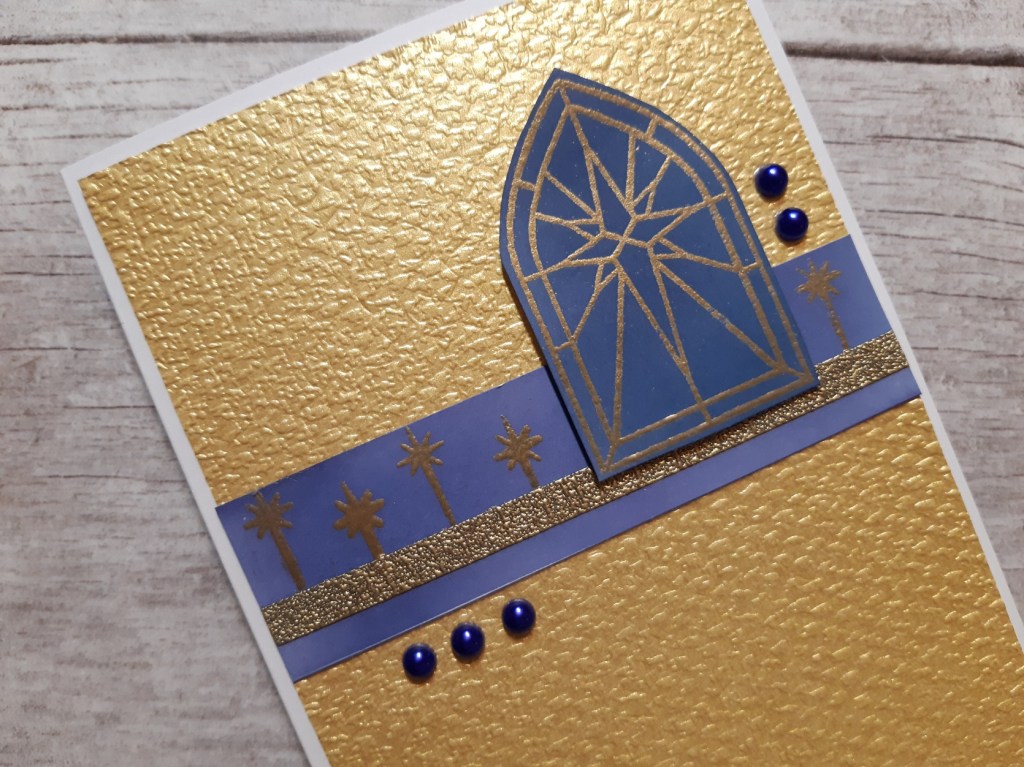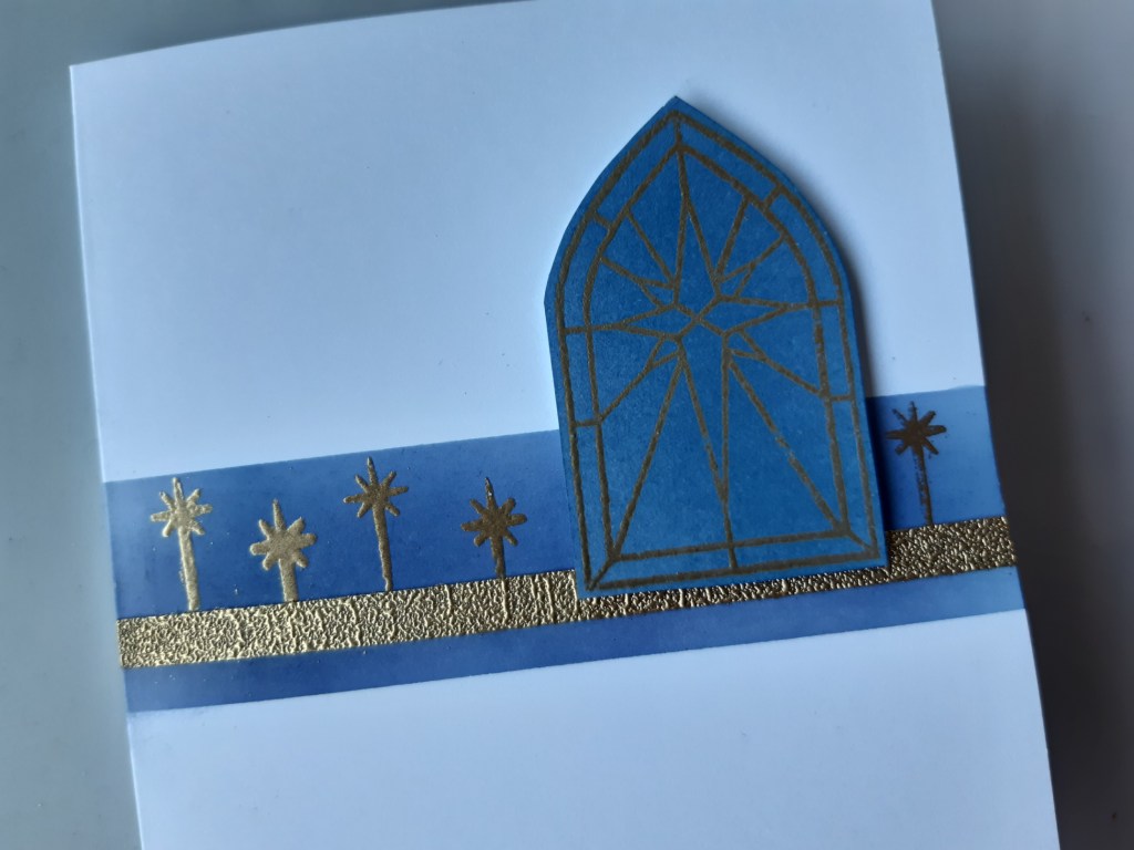 I then stamped the star window, embossed it with the gold metallic powder and fussy cut it, before blending the ‘chipped sapphire’ across it. I attached it the card front with foam pads, ready to finish the card.