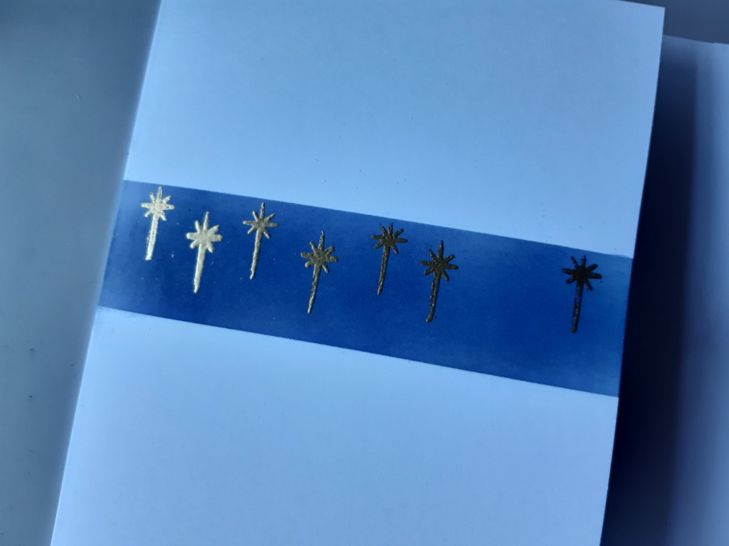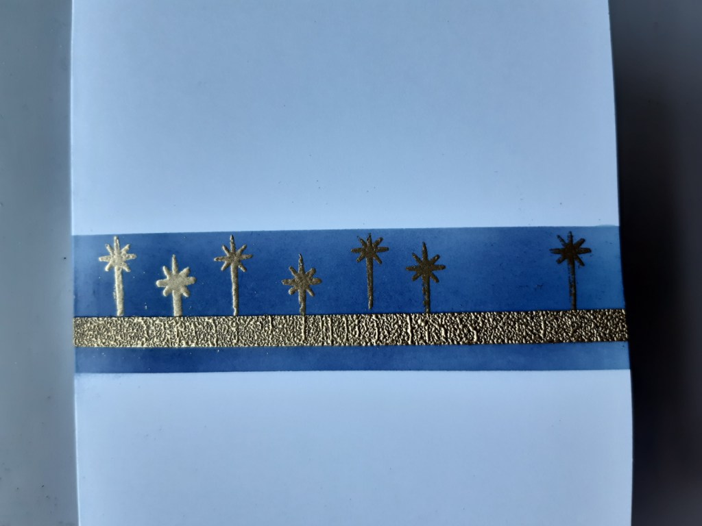 Now this is one of those cards that didn’t quite turn out as I’d originally intended! I’d started with an A6 card blank, masked off a panel across the front and blended ‘chipped sapphire’ Distress Oxide across it. I then repeat stamped the little star from Clarity’s new ‘nativity miniatures’ set and heat embossed it with WOW’s gold metallic powder. (apologies for the blue tone in the photo – not sure what was going on with the camera on my phone!)