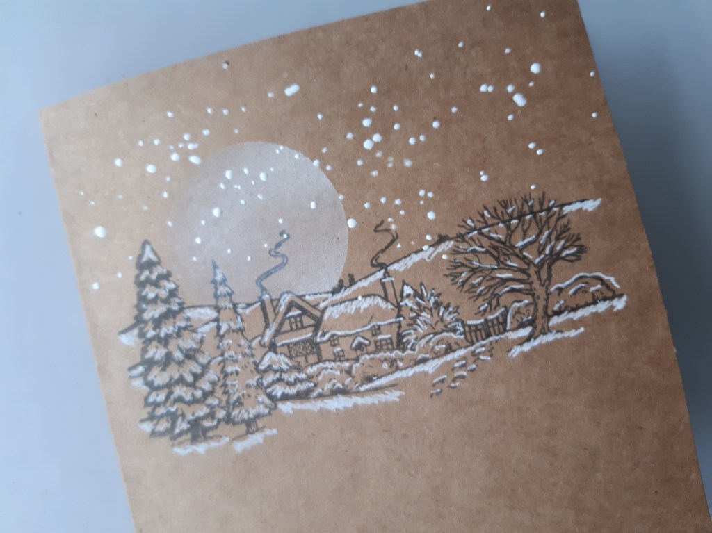 I then used a white gel pen to add the snowy highlights to the image – basically adding the white to the lines on the image where the snow would have settled. I scattered some white ultra high WOW powder across the the sky and heated it to make it look as though it was snowing.