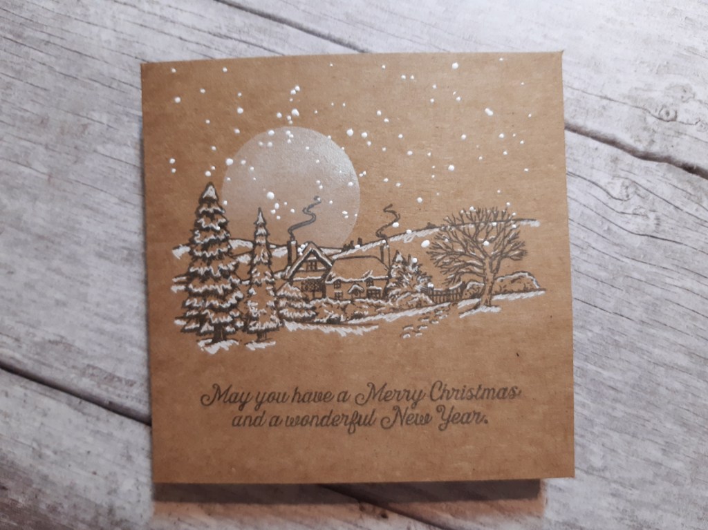 All I then needed to do was add the sentiment (this one is from the church winter scene set), again stamping it in ‘watering can’.