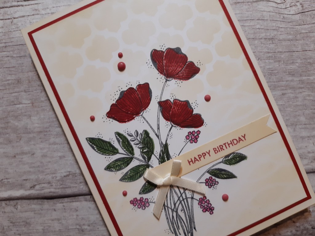 I finished by stamping one of Julie Hickey’s sentiment onto a banner die cut which I’d also brushed with the ‘antique linen’. I popped that across the flower stems, together with a co-ordinating bow and added a few red resin dots around the spray as a final touch.