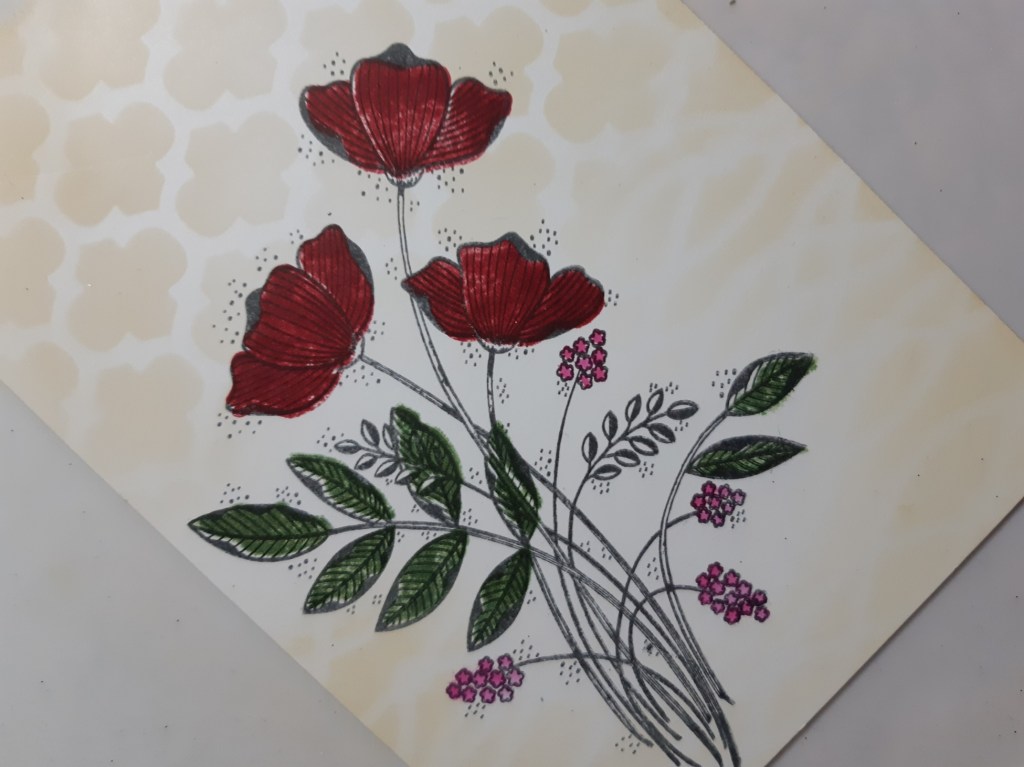 I then used the infill stamps from the set to add ‘cranberry’ Adirondack ink to the flowers and ‘meadow’ to the leaves. I coloured the little flowers with ‘fancy fuschia’ Artistry ink and a waterbrush.