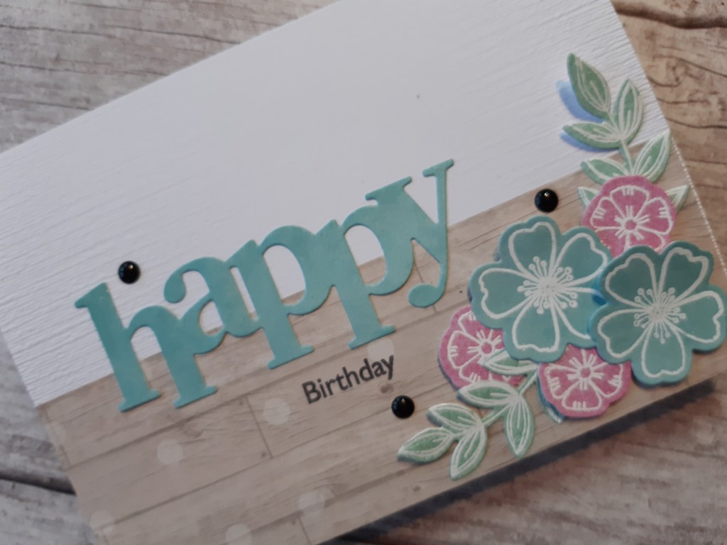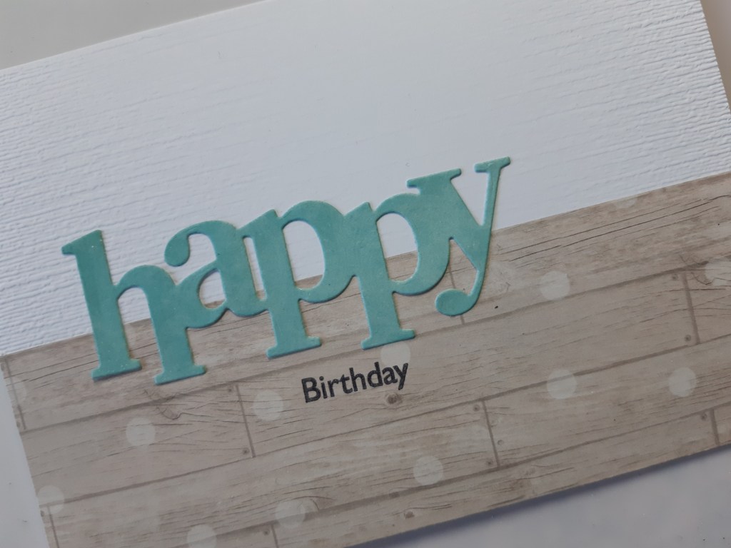 I die cut ‘happy’ in a turquoise paper using Julie’s ‘happy profile’ die and glued it to sit across the top of the paper strip. I then stamped ‘birthday’ from Julie’s ‘everyday sentiments’ in black Archival.