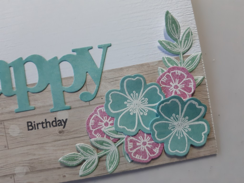 Next was to stamp, heat emboss in white and die cut several flowers and leaves. I used offcuts of paper in the turquoise, pink and green for this – I’m always happy when I get to use up scraps! I then arranged them in the bottom corner of the card and attached them with foam pads or glue.