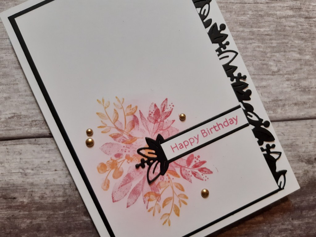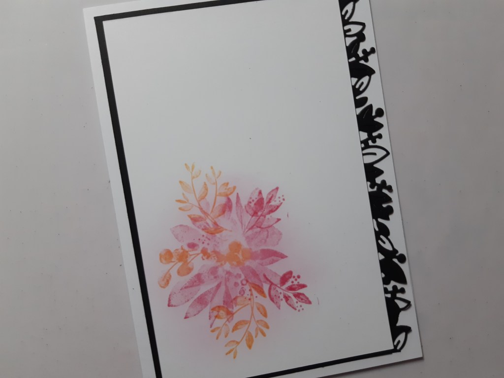 I matted the white card onto a layer of black and added the die cut strip down the right hand side before attaching it to a 5×7 card blank. At this point I felt the flowers looked to be in too narrow a placement, so added a couple more little sprigs in ‘polished pink’ to balance it out. I also blended a little pink into the background of the flowers.