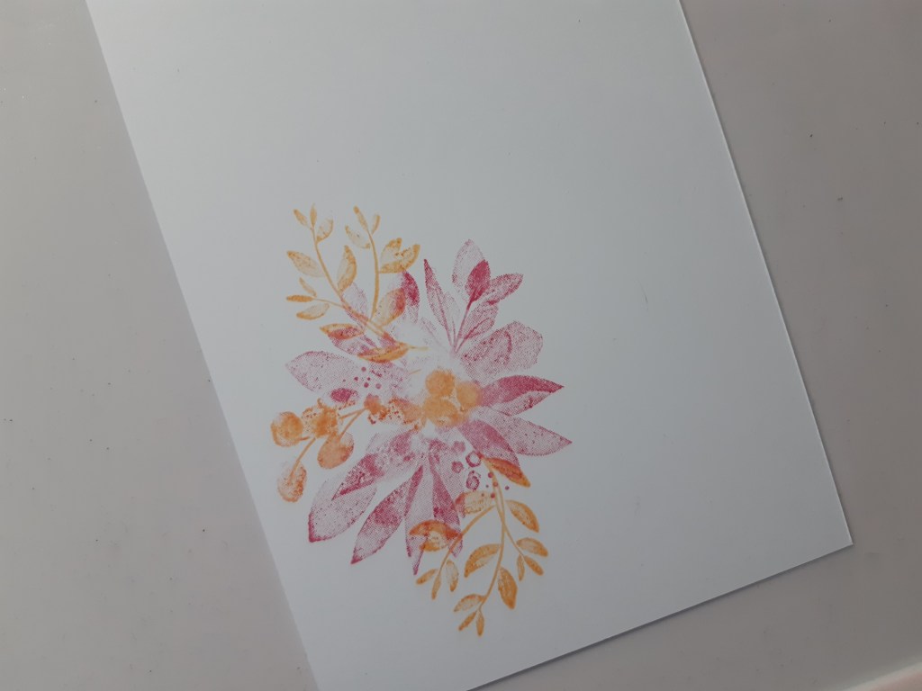 I started with a piece of white card trimmed to fit a 5×7 card blank and blended ‘polished pink’ and ‘pale papaya’ ink onto the larger floral spray from the set before stamping it (I used SU’s write markers for this). I also added a couple of leafy sprays in the ‘pale papaya’.