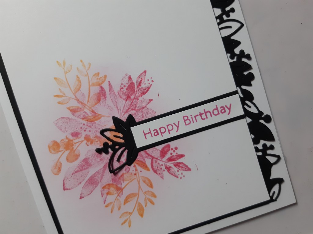 I then die cut the banner from the set in black card, but with just one floral end. I cut a narrow piece of white to layer on it and stamped the sentiment from SU’s ‘art gallery’ in the ‘polished pink’.