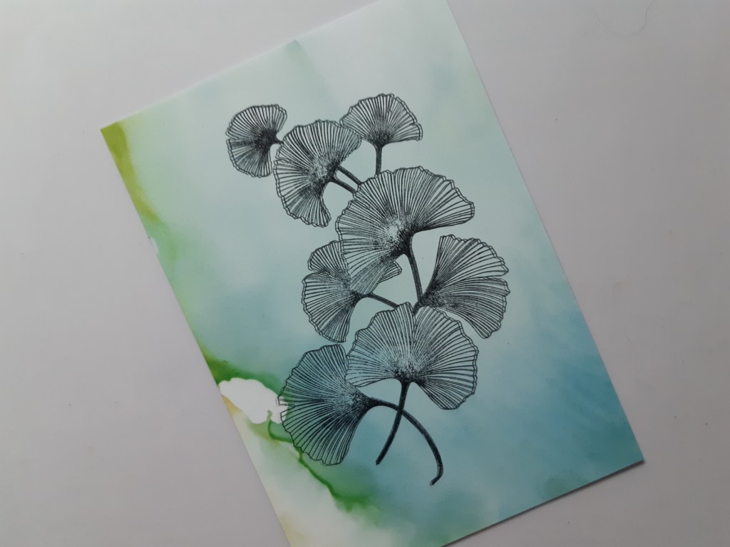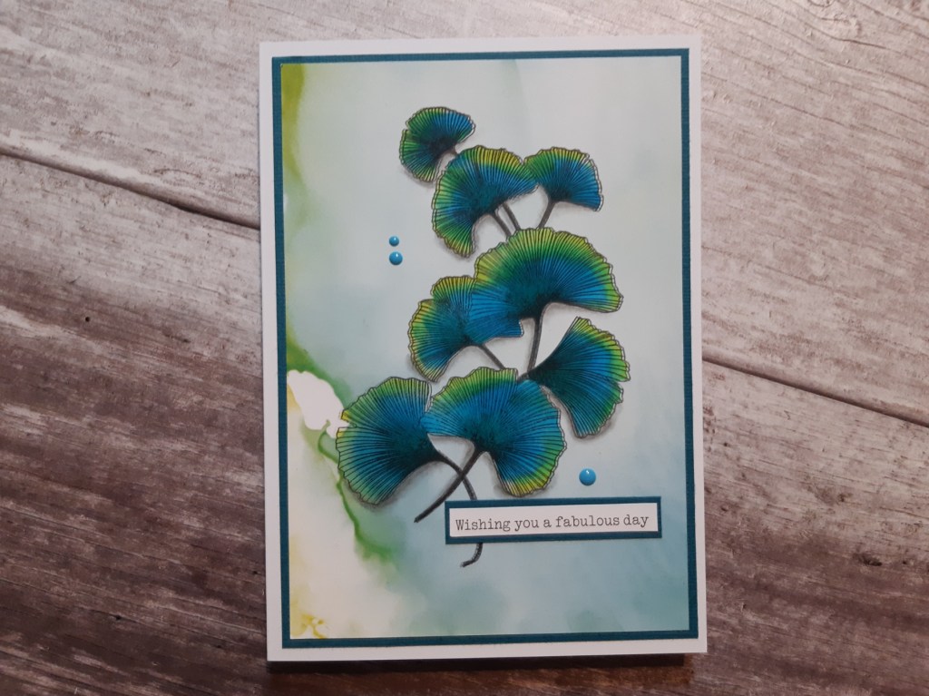I started with a piece of designer paper from ‘Barb’s favourites – Antarctica’ by Claritystamp and cut it down to fit a 5×7 card blank. I then stamped the large ginko leaf spray onto it in ‘watering can’ Archival. I had a bit of trouble with this in getting the centres of the leaves to stamp clearly – I had a couple of goes at it as I was using my stamping platform. Although the leaf centres are not solid, I decided it was OK as I was going to add colour to them.