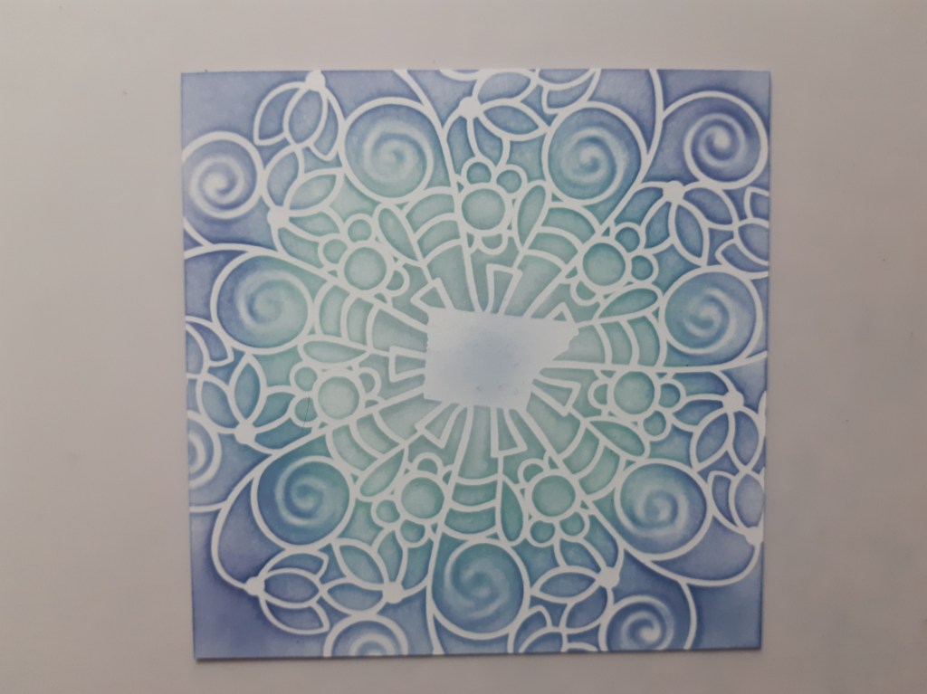 For the first card, I attached the ‘snowdrop doodle’ round stencil to a white square that I’d trimmed down to fit a 5×5 card blank. I used a small piece of masking tape on the centre to hold it in place (it’s a frameless stencil), which didn’t matter as the die cut topper would be going over that part, and then brushed Distress Oxides in ‘speckled egg’, ‘salvaged patina’ and ‘chipped sapphire’ across it, starting with the lightest one in the middle.