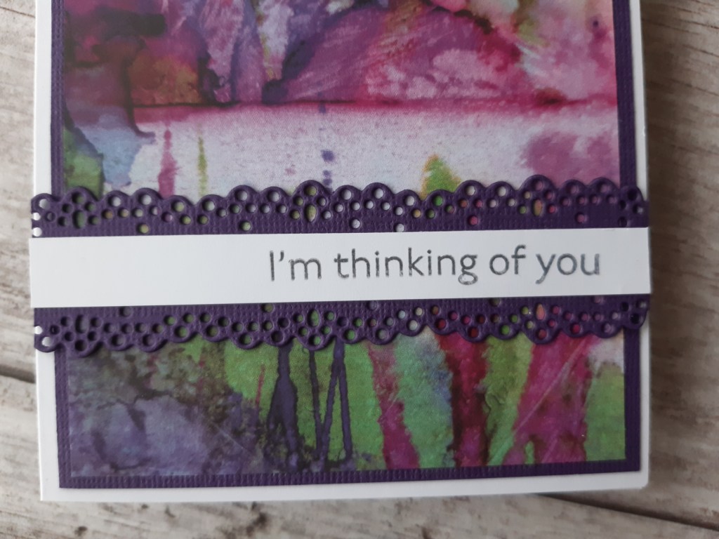 I cut the panel die in purple card and added a strip of white across the centre, after stamping the sentiment onto it. That then went onto the front of the card – nice and easy!