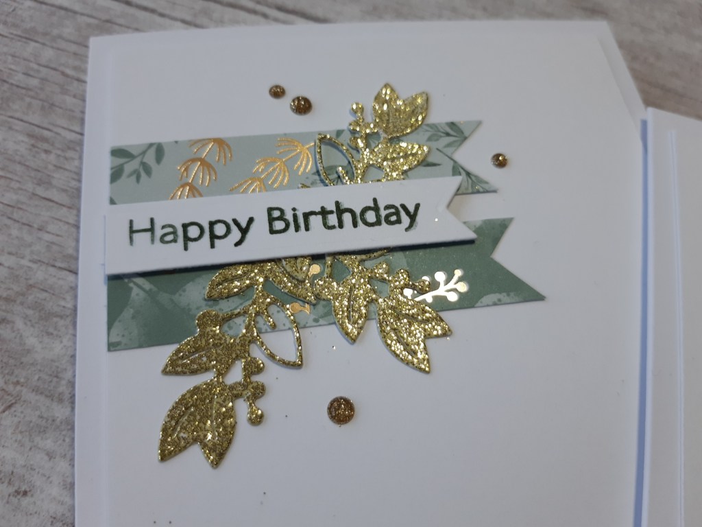 I brayered WOW clear ink onto a spare piece of white card and heat embossed it with ‘peridot’ sparkly embossing powder, then cut the small leaves from SU’s ‘Eden’ die set. I stamped the sentiment from ‘art gallery’ in evening evergreen’ onto a die cut banner (I used a Write marker, as I don’t have the ink pads), then laid the over the strips of dsp and glued the leaves into place. A few gold sparkly dots completed it.