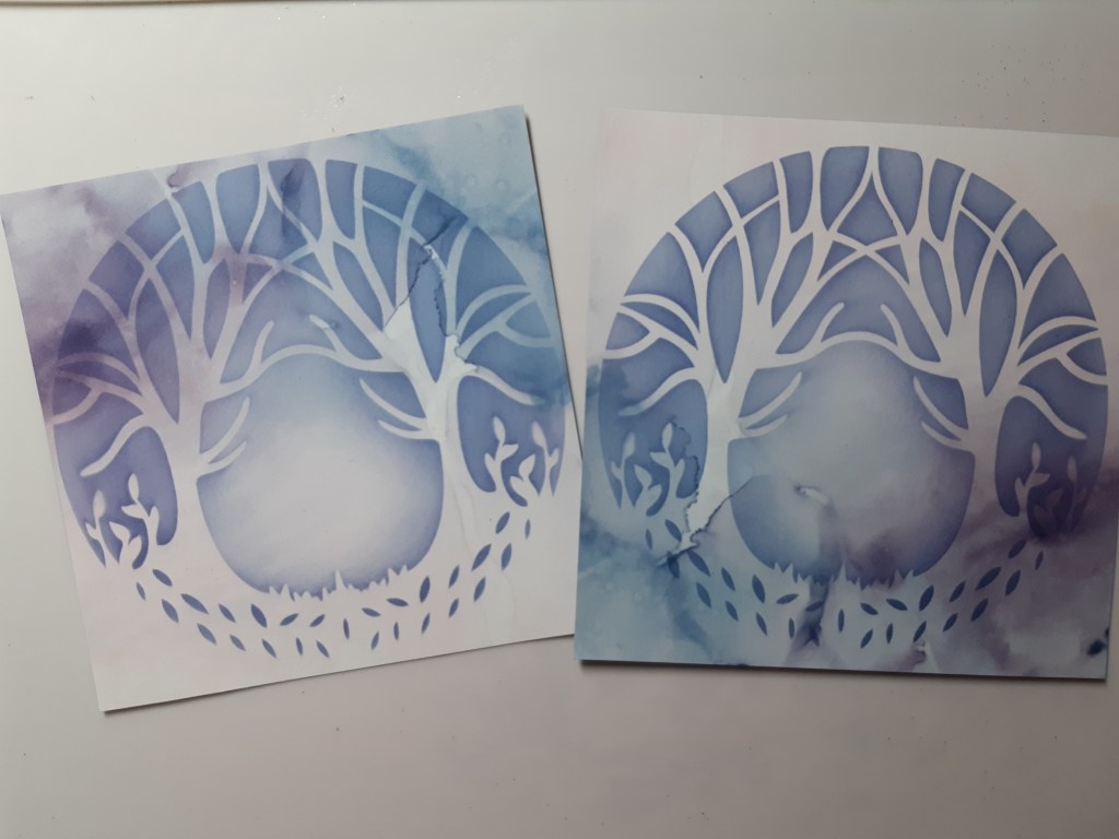 I deiced to continue on my quest to use up more of my large stash of designer papers, so cut a piece of Clarity’s ‘Antarctica’ to fit a 6×6 card blank. I anchored the stencil with some low tack tape and brushed ‘chipped sapphire’ Distress Oxide through it. You’ll see in the photo that there are two versions of this – I did the first one with the darker part of the paper ta the bottom but decided it didn’t look wintery enough so stenciled a second one with it the other way round. (I will use the first one for another card…. eventually!)