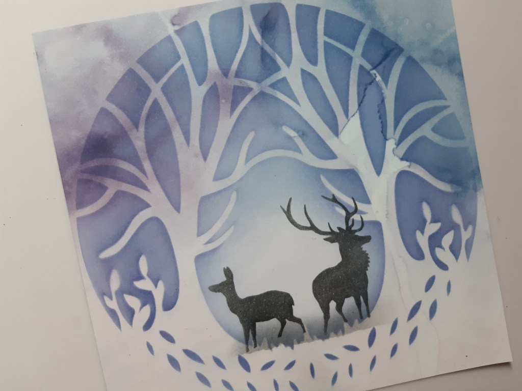 I then positioned the ‘deerscape’ mask so two of the deer were stood between the trees, and masked off the rest of the herd with sticky notes. I used a sponge to colour them in with ‘watering can’ Archival ink, and then tore a scrap piece of paper to sponge ink across for the ground under their feet (so they weren’t floating in mid-air!)