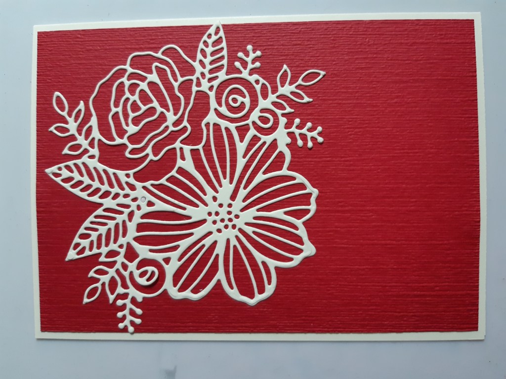 For the second card, I cut a mat in SU’s ‘real red’ cardstock, ran it through the ‘subtles’ embossing folder and attached it to the card front. I then glued the vanilla floral die cut onto it.