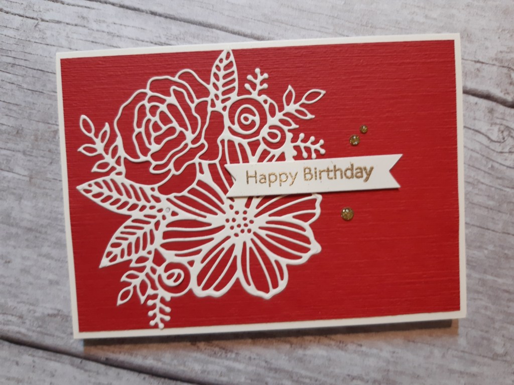 I started by making a couple of A6 card blanks using SU’s ‘very vanilla’ cardstock, as I’ve only got white or black pre-made ones in my stash. I then cut the large floral die twice, once in red and once in the vanilla. I die cut one of the narrow rectangular frames from Julie Hickey’s dies in gold card, glued that onto one of the card fronts and popped the red die cut on top.