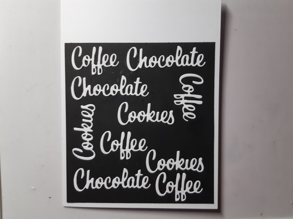 I then die cut the sentiment in black and stuck it to a topper I’d cut from the ‘tasteful labels’ dies. That then went onto the card front using foam pads. I was cross with myself though – if I’d planned it a bit better I would have left the top ‘chocolate’ off so it wasn’t obscured by the topper!